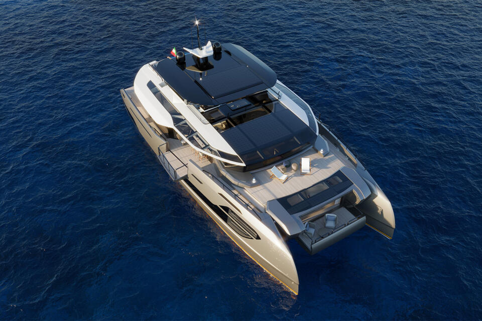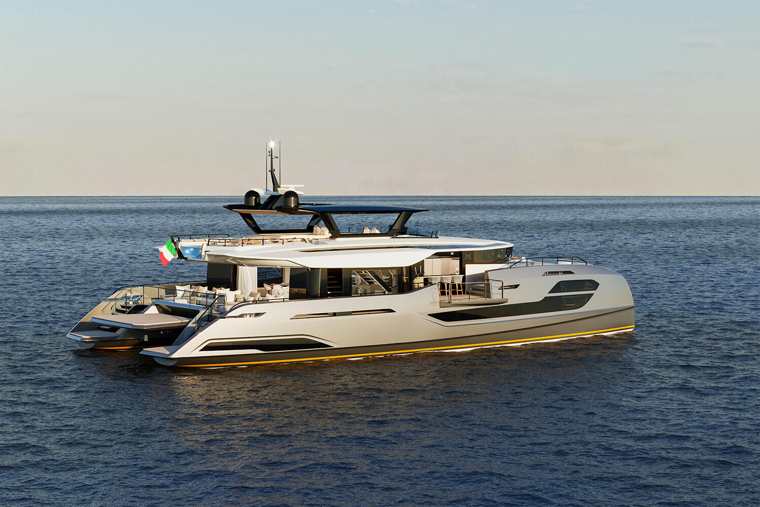 “This new catamaran, with a quieter electric motorisation, takes advantage of a hybrid propulsion system that significantly reduces C02 emissions,” says the company in a statement. “Consumption efficiency is augmented by glass impregnated solar cells that produce additional energy for on-board utilities. Sustainable or natural materials such as re-purposed fibres, sustainably assessed paints and plasters, alternative leathers and reclaimed woods will be considered without compromising quality or finish.”