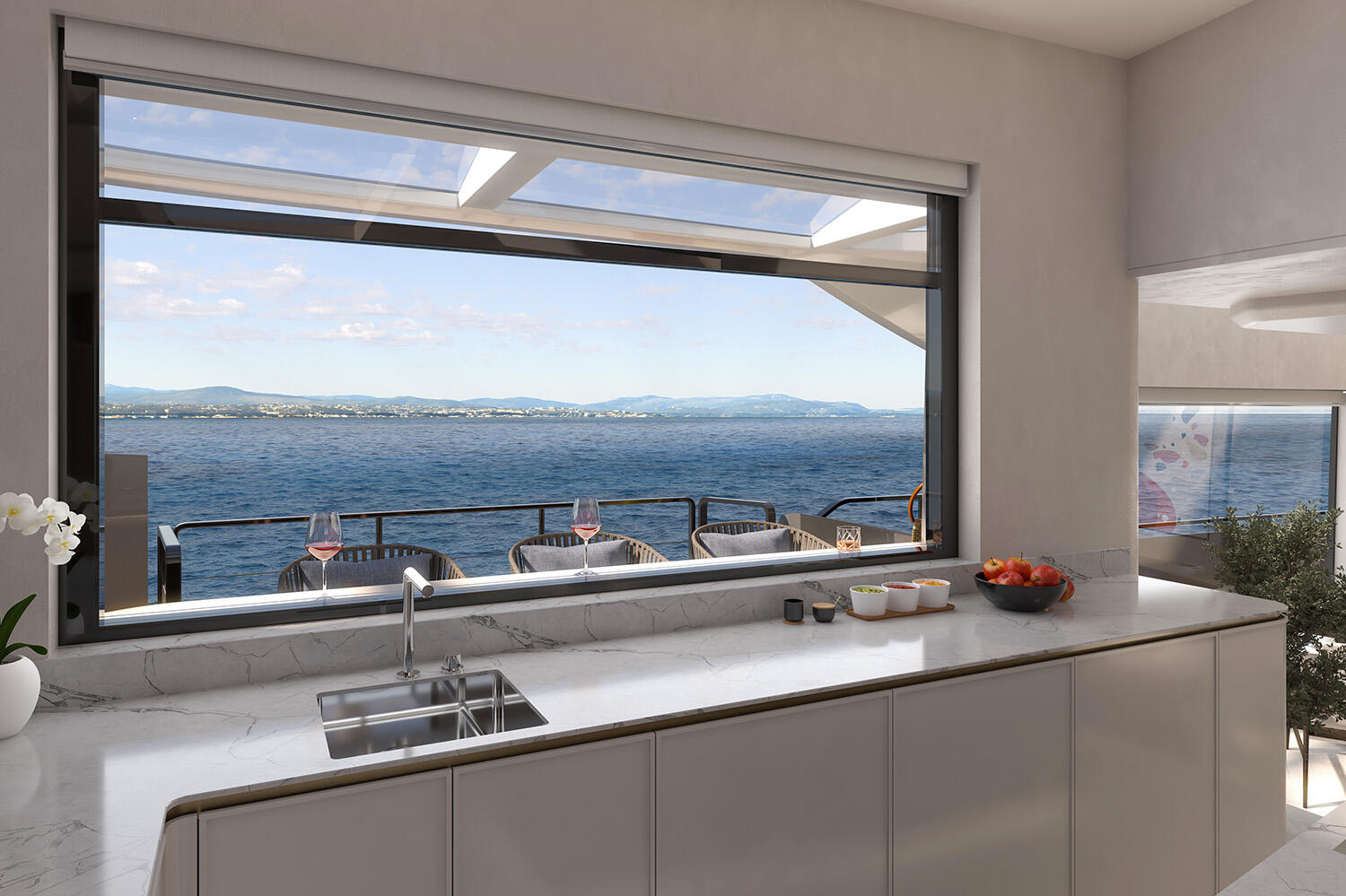 Nestled forward between the two hulls, the master stateroom terrace overlooking the sea may be lowered in calm waters to offer exceptional views while retaining maximum privacy. With the terrace in dropped-down position, the glass doors close it off to provide protection from wind and bad weather. When closed, the master cabin maintains its seaworthiness and offers protection and sound damping thanks to its inherent design.