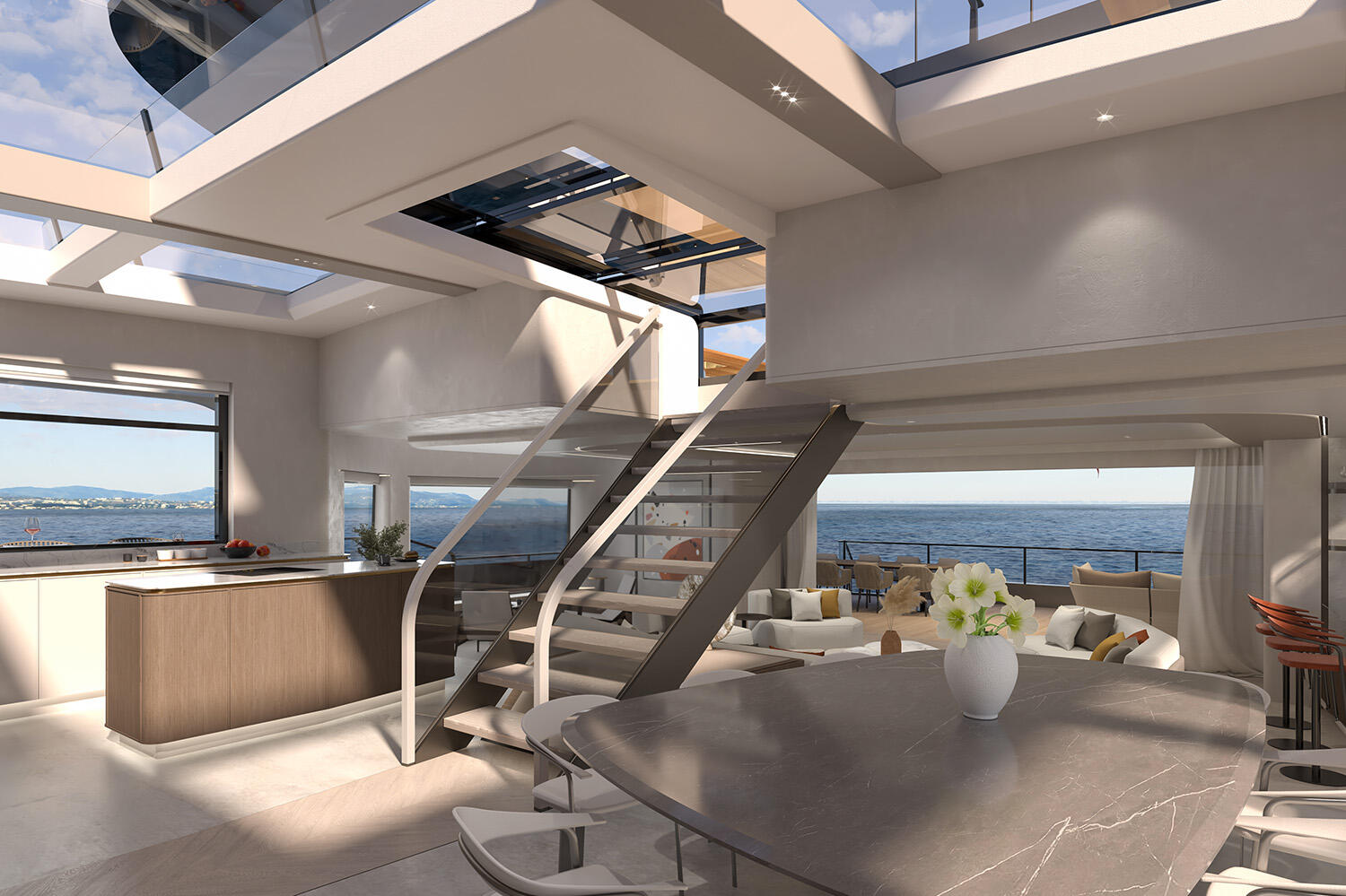 The current layout offers VIP cabins with direct access to the transom in order to enjoy the sea without having to traverse the interior. VILLA continues on the Extra’s beach club approach of facilitating aft-ward views with direct connection to the sea. The main deck on the X30 VILLA has extra high ceilings and large panoramic windows intended to maximize outdoor views while letting natural sunlight indoors. The layout is subdivided into smaller convivial multi-level zones to break up the space.