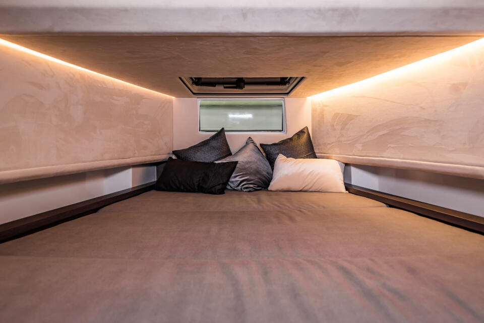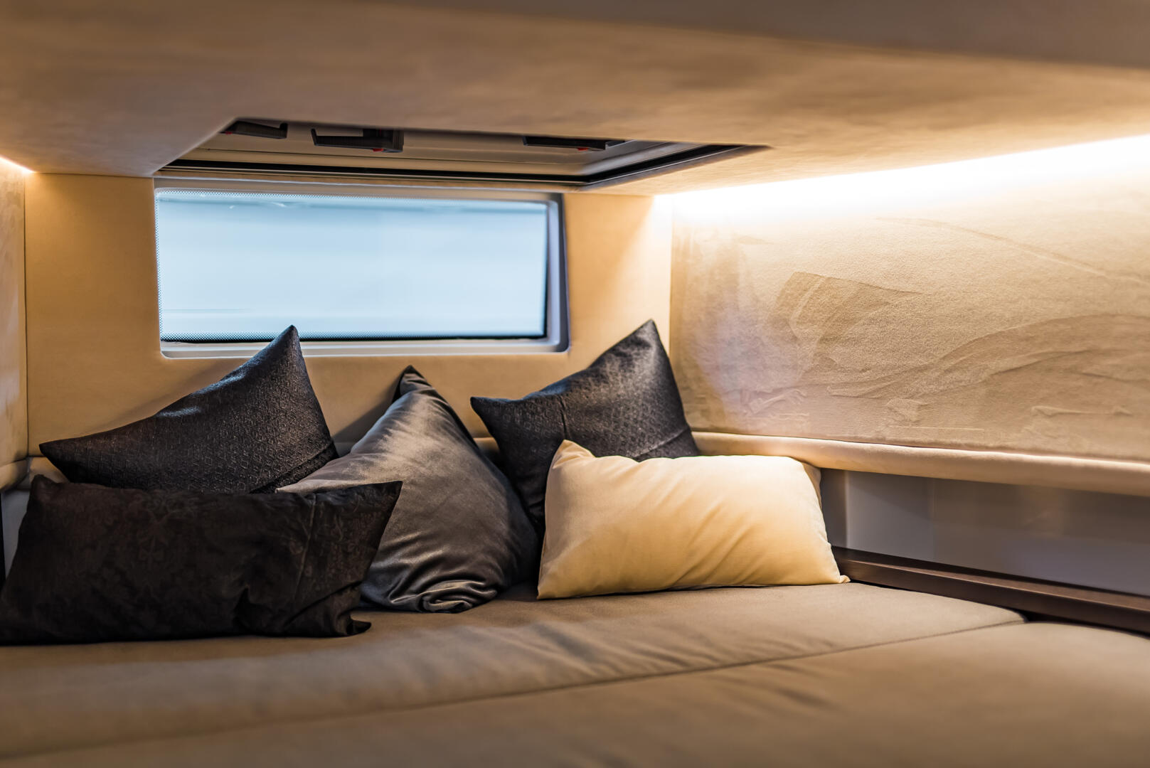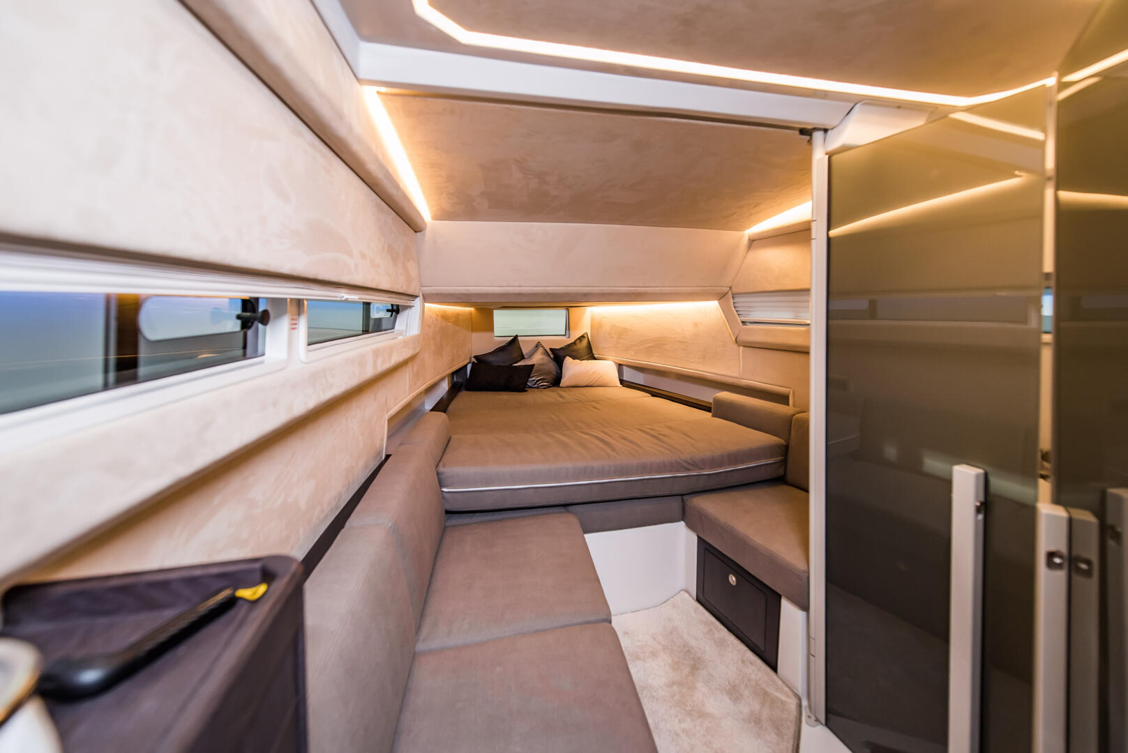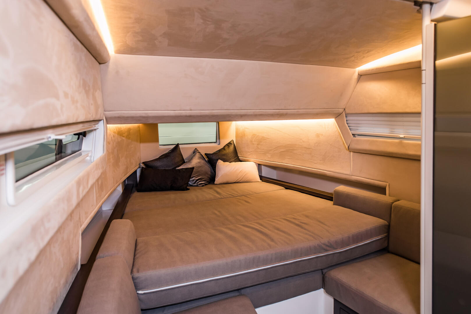 The most important part of every vessel is the captain's station and steering wheel. We have chosen a minimalistic design in matte dark gray, but packed with technology. Two Garmin charts are tucked into the upper part of the console for protection from the sun and better visibility, while all other controls and switches are logically located so that they are easy to use. The captain's bench seats up to four people and has a folding backrest that can be rotated when not steering. Between the first and second rows of seats there is a large folding table that comfortably seats eight people, so long gatherings with space for food and drinks are enjoyable. Sliding doors from the captain's bridge lead directly into the spacious and naturally lit cabin. Of course, there is also a toilet and a shower. In the bow you will find a spacious berth that can be converted into a U-shaped couch if necessary, while the sides and ceiling of the cabin are upholstered for maximum comfort.