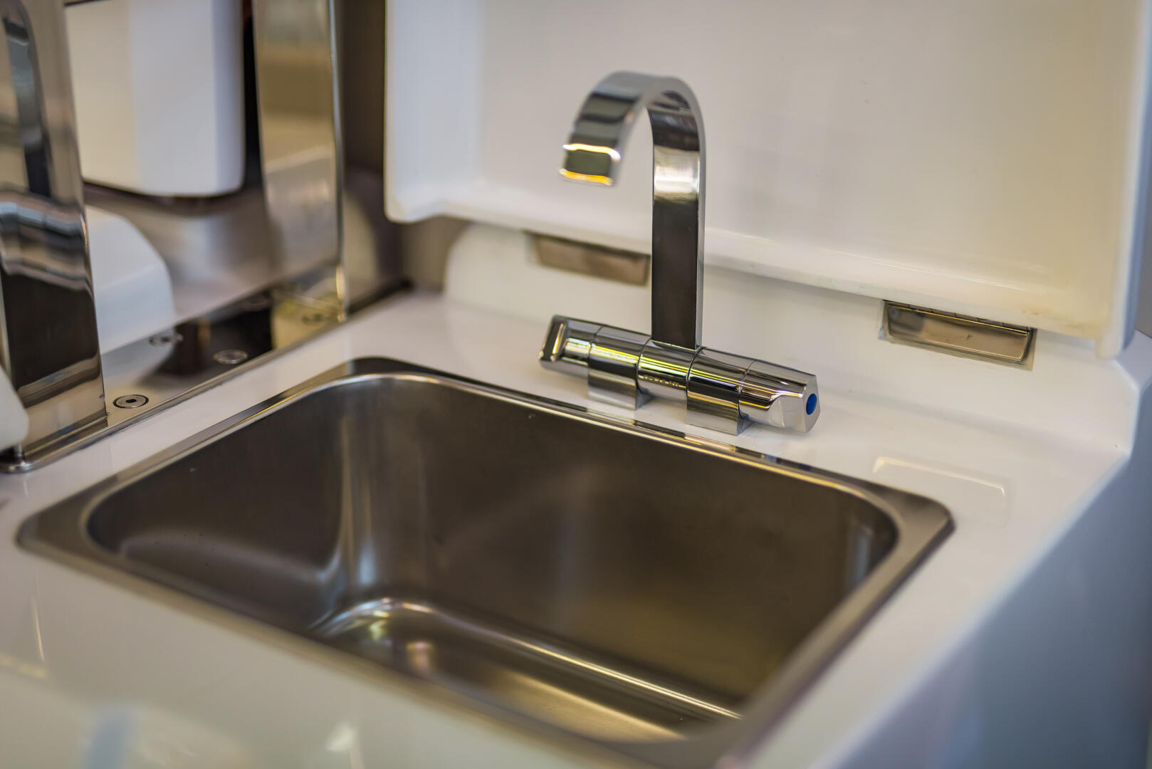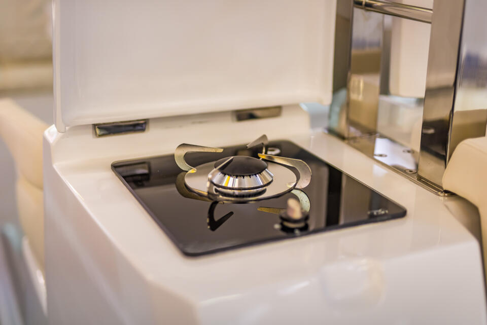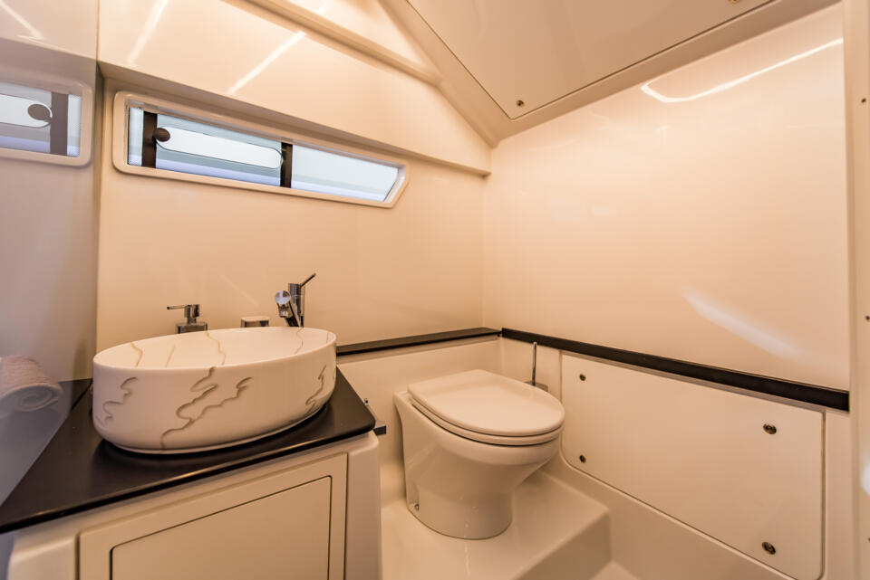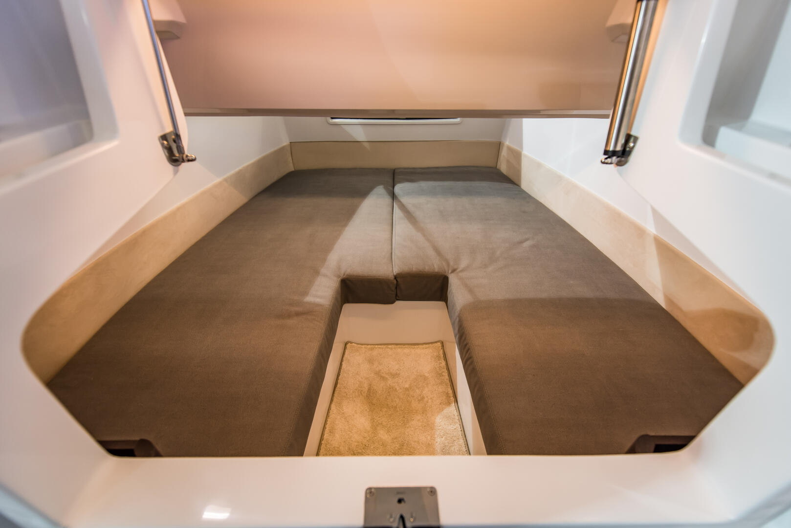 The most important part of every vessel is the captain's station and steering wheel. We have chosen a minimalistic design in matte dark gray, but packed with technology. Two Garmin charts are tucked into the upper part of the console for protection from the sun and better visibility, while all other controls and switches are logically located so that they are easy to use. The captain's bench seats up to four people and has a folding backrest that can be rotated when not steering. Between the first and second rows of seats there is a large folding table that comfortably seats eight people, so long gatherings with space for food and drinks are enjoyable. Sliding doors from the captain's bridge lead directly into the spacious and naturally lit cabin. Of course, there is also a toilet and a shower. In the bow you will find a spacious berth that can be converted into a U-shaped couch if necessary, while the sides and ceiling of the cabin are upholstered for maximum comfort.