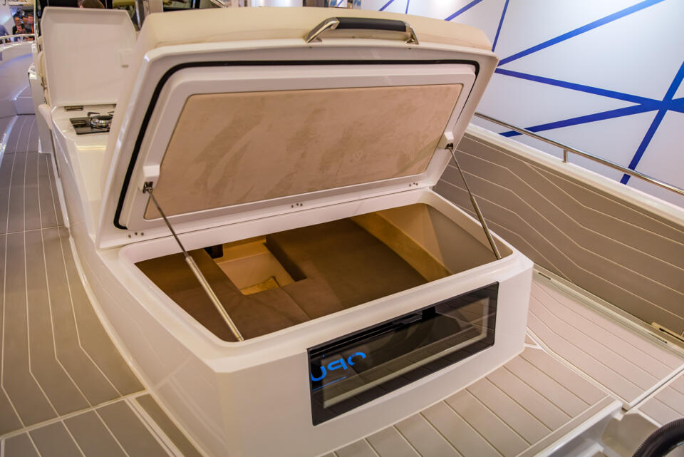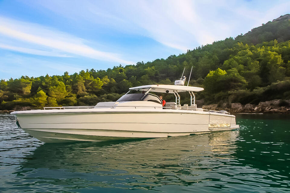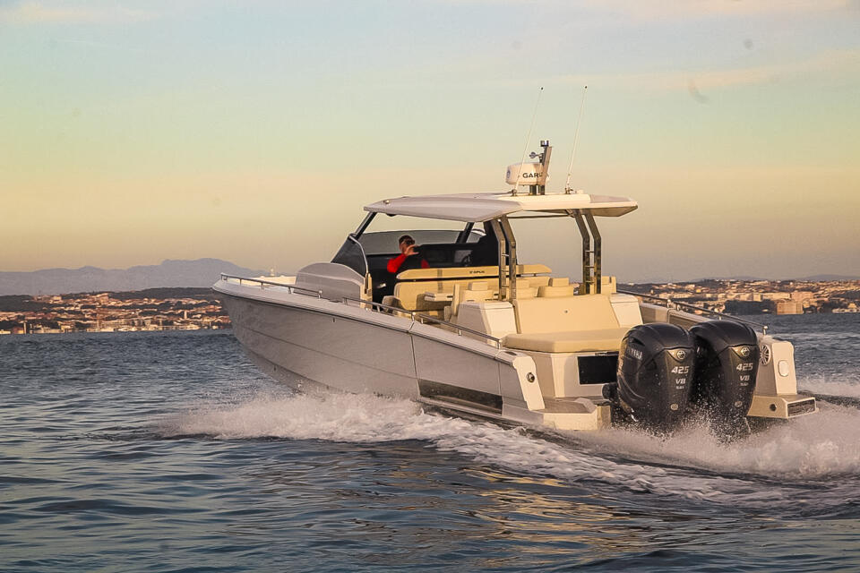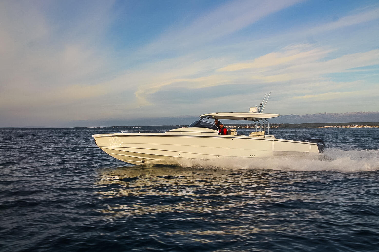 The Opus 12, is powered by two 425 hp Yamaha V8s outboard engines, which we believe today represent the best that money can buy. Its maximum speed is 53 knots, while at a speed of 40 knots it consumes only three liters of fuel, so no destination is too far. This combination provides superior performance, speed and handling.