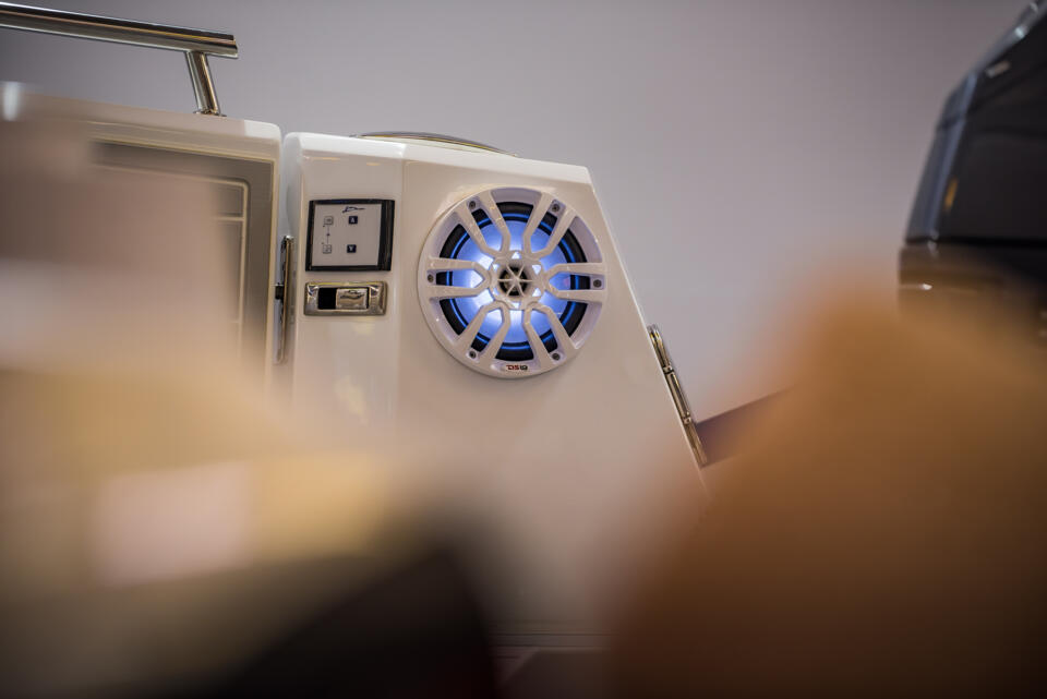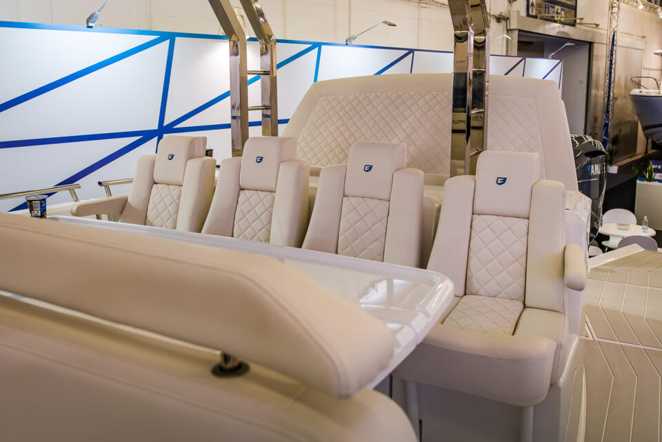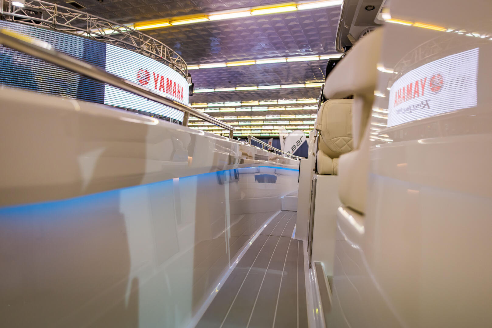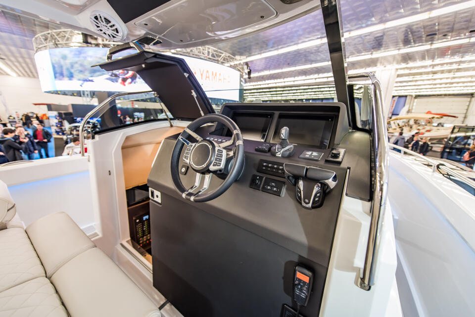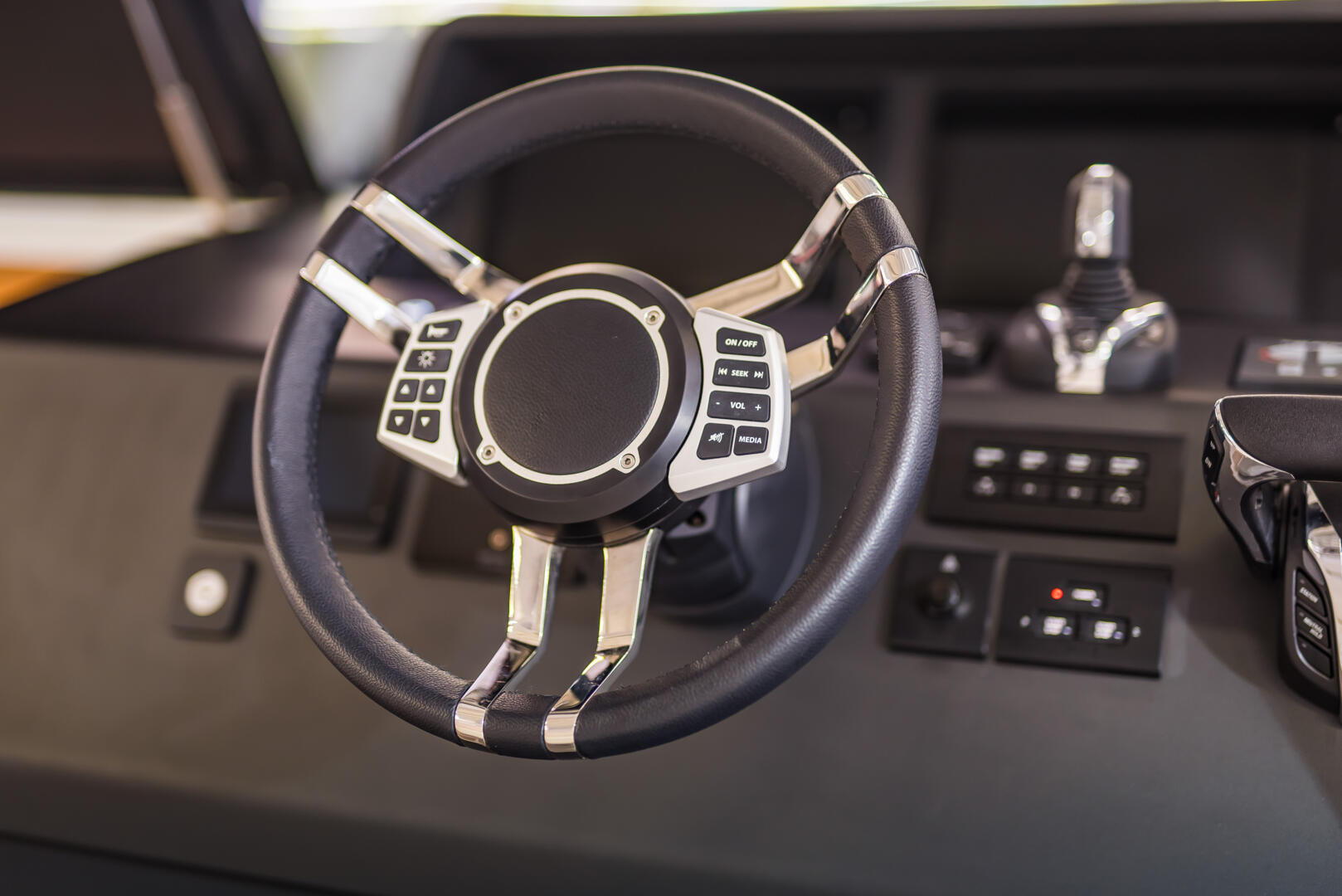 Even during a hard tilt in a turn, it easily maintain its position, inspiring confidence and sporting adventure. Steering a 12-meter boat at high speeds or in tight spaces in moorings and marinas requires a certain level of skill, but the Yamaha joystick control system for two outboard motors and a bow thruster is so simple that even an average skipper can master it.”