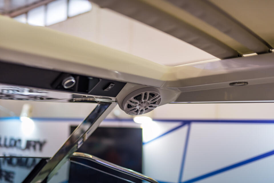 “The walkway around the ship is designed deep enough for safe movement around the ship. A low but massive oval fence stretches along the entire length of the boat. When designing the vessel, attention was paid to the smallest details, which can be seen for example on the folding cleats on the bow or the anchoring system that is completely hidden in the bow and covered with a cushion on top so that it can be used as a bench when the boat is stationary. There is also a large glass area connecting the cabin roof to the bow and can be opened to allow maximum light into the cabin. The roof of the cabin is reserved for a sundeck with a backrest, all covered in white cushions. In addition, the Opus 12 also has one electrically opening platform on each side, the so-called “balconies”, which expand the space of the vessel.