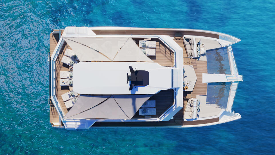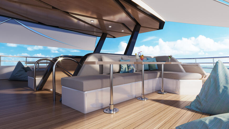 Na obje palube moguće je ležanje, sunčanje i sjedenje na elementima različite visine. Osmišljeni su tako da svatko može pronaći mini ambijent za osobni doživljaj prostora, bilo da se opušta u paru ili grupi prijatelja. Separei za dvoje, koji su svoje mjesto našli na granici otvorenog i zatvorenog prostora, simbol su koncepta povezanosti na brodu. To znači da su svi elementi međusobno povezani – tako da nema jasne granice niti između vodoravne i okomite ravnine koje se spajaju jedna s drugom. Po potrebi se gornja paluba lako pretvara u prostor za team building okupljanja ili proslave. Na flybridgeu nalazi se i svojevrsni VIP salon - dio s ležaljkama koji je odvojen od ostalih, s lijepim pogledom na more. Sunčana jedra pružaju potrebnu količinu hlada tijekom vrućih dana na moru.