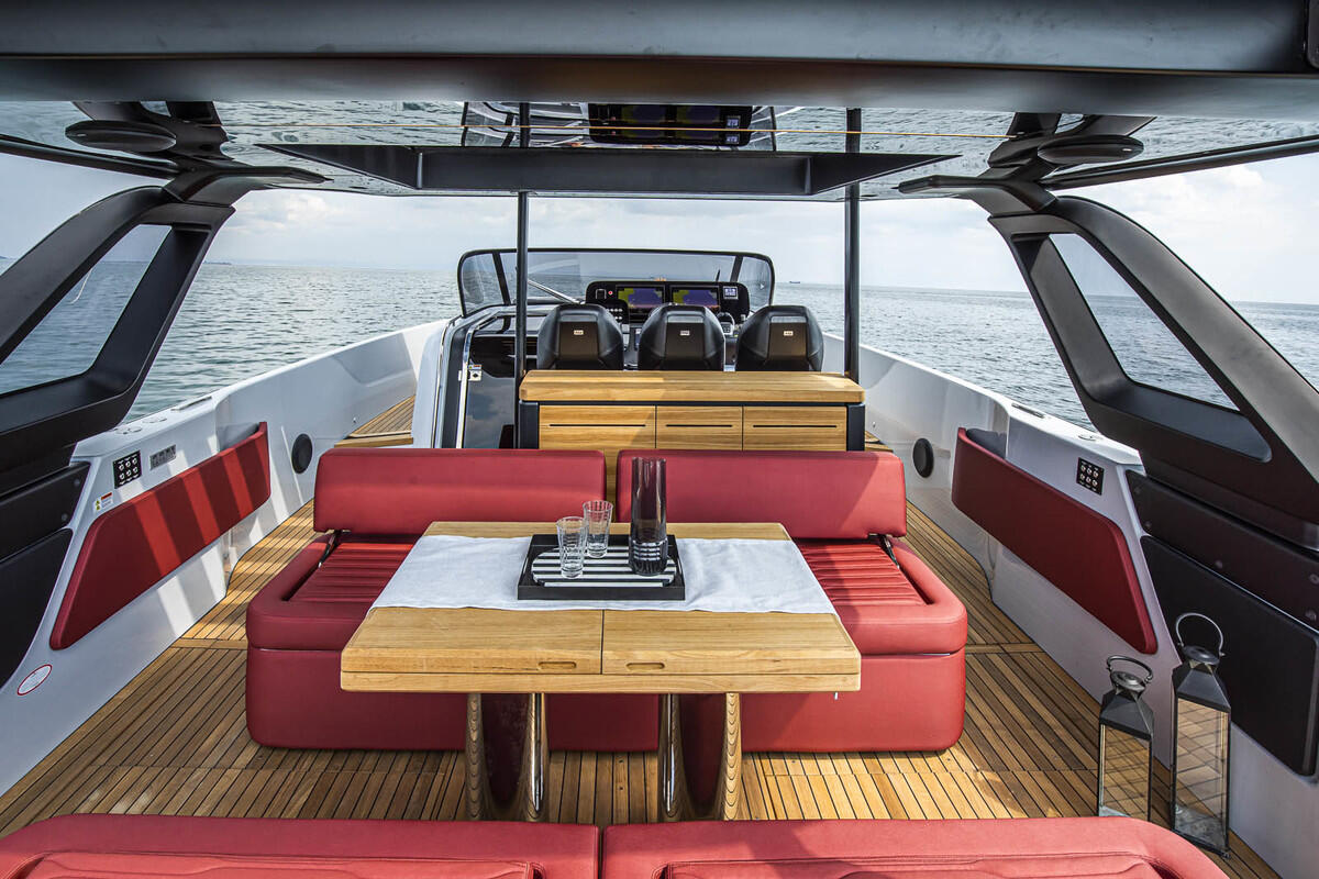 Vanjski dio nudi prostrana područja za sunčanje i opuštanje na prednjim i krmenim sunčalištima s kombinacijom ležaljki, sjedala i stolova. Krmena paluba sadrži dva sklopiva hidraulična bedema koji, kada se spuste, značajno povećavaju veličinu sunčališta. Platforma za plivanje također se može podići kako bi se dobio ravni pod koji se proteže preko krmene terase za sunčanje. U središtu A46, T-krov od karbonskih vlakana, uključujući brojne letvice za otvaranje i zatvaranje, pruža zaštitu nad pilotskom stanicom, kuhinjom i blagovaonicom u koju može stati do 10 osoba. Pilotska stanica ima tri vrhunska automobilska sjedala koja omogućuju jednostavno rukovanje letjelicom.