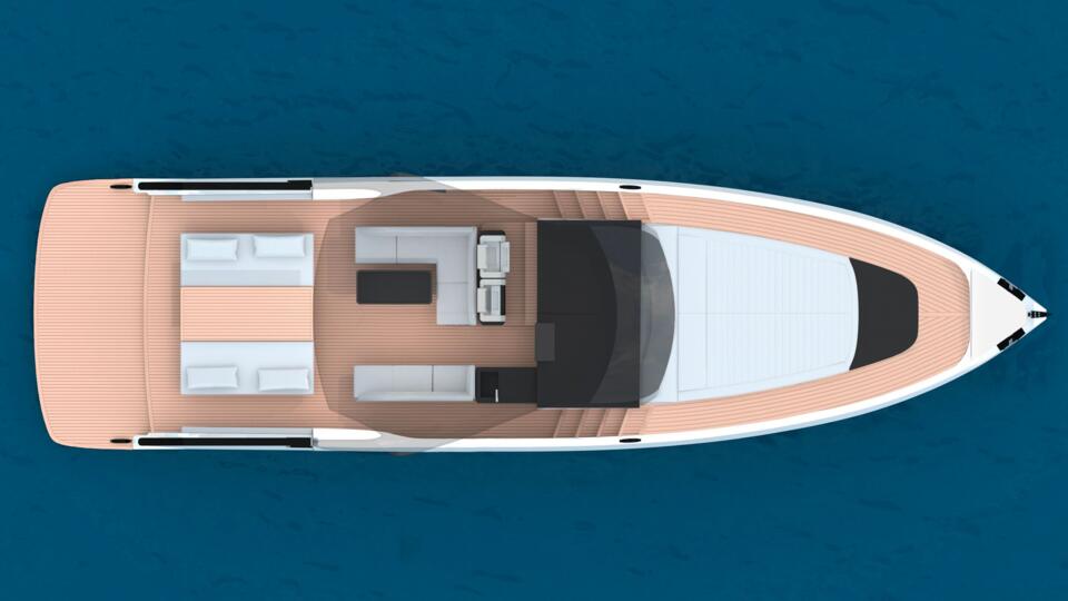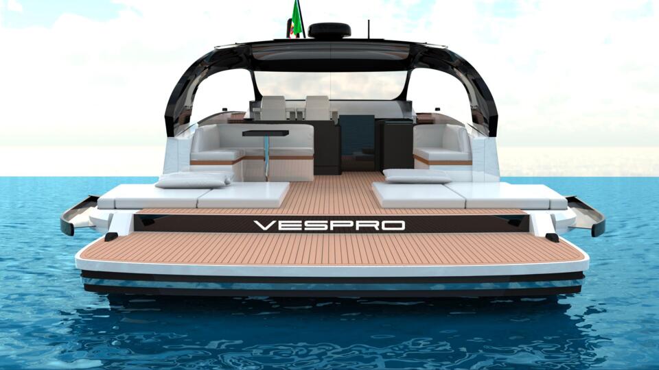 Jednostavan, ali funkcionalan raspored odabran je za prvi VESPRO: stražnji kokpit sastoji se od velike ležaljke za sunčanje sa sklopivim pločama kako bi se povećala veličina krmene palube i platforme za plivanje, dok su prednja paluba i druga velika sunčalište lako dostupni putem prikladne šetnice s obje strane. Ispod tvrdog krova, uz kormilarsku stanicu, nalazi se udoban dnevni boravak, dok smještaj ispod palube uključuje udoban vlastiti V-ležaj na pramcu i prostrani salon s kuhinjom; po želji se može postaviti još jedna kabina za goste iza stepenica koje vode ispod palube. Sve je upotpunjeno zadivljujućim vanjskim izgledom VESPRO-a, koji kombinira klasični otvoreni stil s hladnom i suvremenom oštricom. Vjetrobransko staklo se može uvući u krov putničke kabine za potpuno iskustvo "en plein air", dok su otvori za zrak u strojarnici pametno integrirani u široke stražnje stupove koji podupiru tvrdi krov.