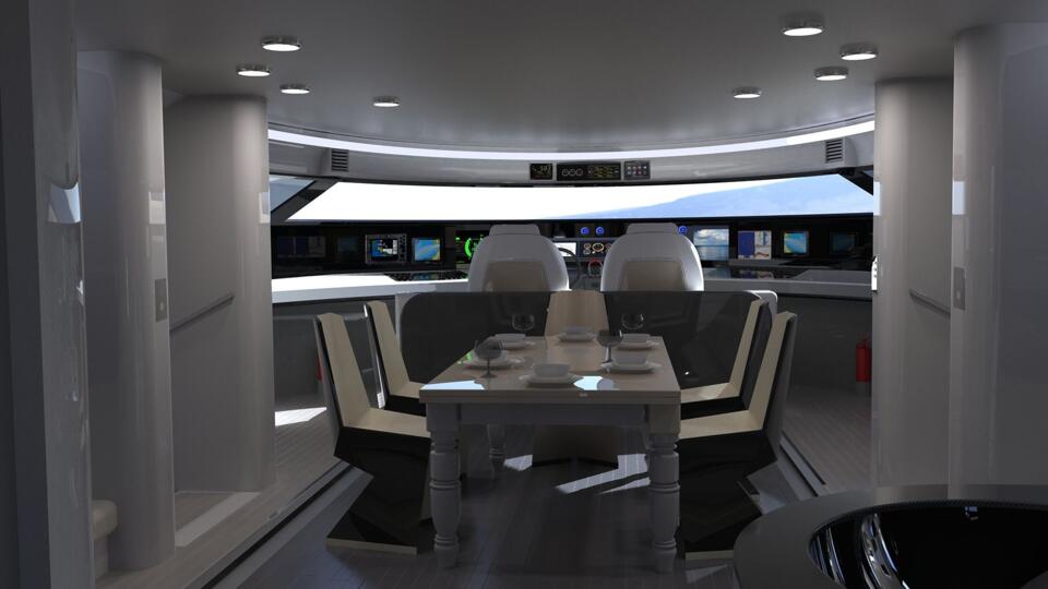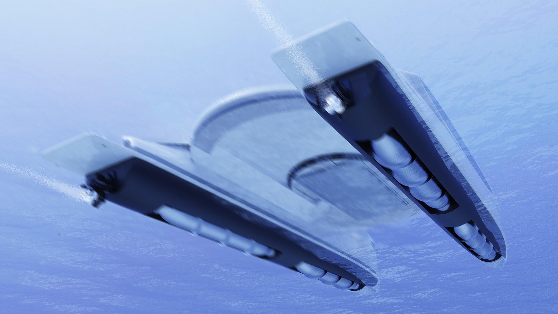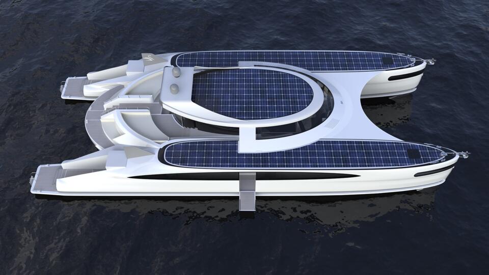 Dvostruki Caterpilar dizelski motori snage 890 KS primarni su izvor energije koji će brod pomicati najvećom brzinom od 25 čvorova. Njegov solarni niz može osigurati 6 čvorova snage u vodi, istovremeno pružajući energiju za napajanje i punjenje. Prema Designboomu, metalni cilindri smješteni u sponama ispod vodene linije koriste trenje vodom za punjenje baterija dok su u tijeku.