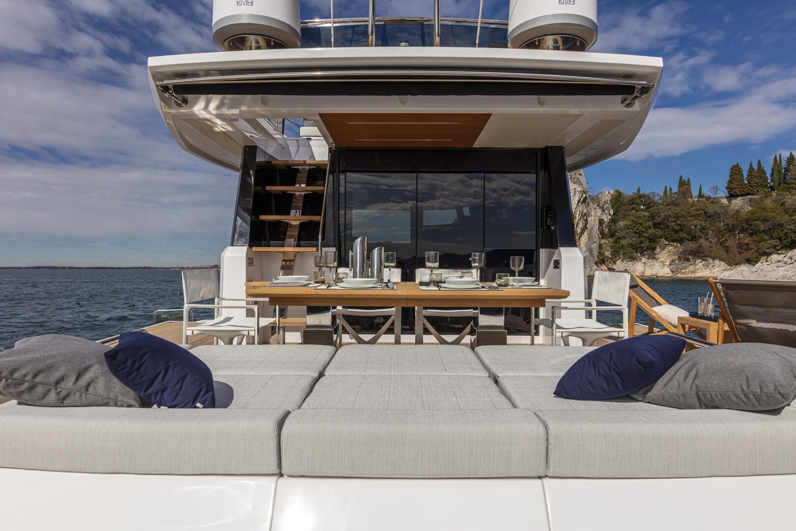 Minimalan i sofisticiran dizajn uspostavlja dijalog između interijera i eksterijera, s bočnim otvorima koji se protežu do vodene površine, pa se na ovoj jahti stvara osjećaj kao da ste u luksuznom morskom terencu.
