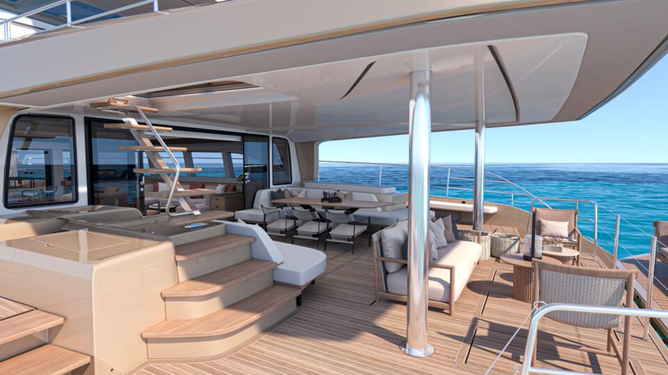 Groupe Beneteau’s Lagoon catamaran brand presented more details of its largest powercat to date – the Lagoon Eighty 3 – at its French shipyard in Bordeaux last week. The Lagoon Eighty 3 is the result of a collaboration between the Bordeaux shipyard and VPLP naval architects, Patrick le Quément for the exterior design, and Nauta Design for the interior. This new powercat is the bigger sister to the Lagoon Eighty 2 sail catamaran. She will have her world premiere at the Miami International Boat Show in February 2026.