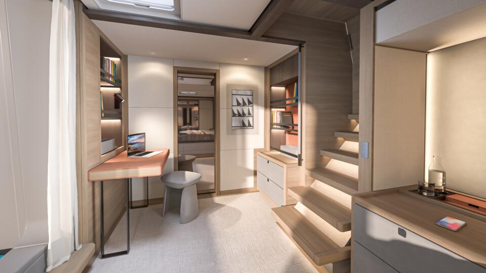 The large modular saloon can be arranged to create different living spaces. The owner’s cabin features a king-sized bed with views of the sea, a private terrace, and space for relaxation.
